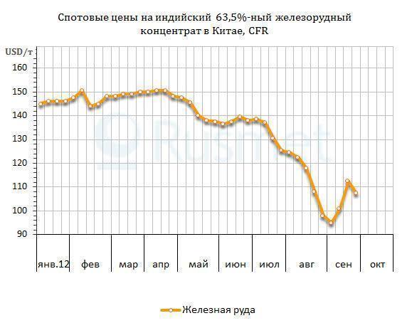 /Rusmet.ru, Виктор Тарнавский/ В последний месяц спотовые цены на железорудное сырье на мировом рынке отличаются повышенной нестабильностью. В начале сентября стоимость 63,5%-ного индийского концентрата, поставляемого в Китай, сократилась до около $95 за т CFR, что соответствовало уровню ноября 2009 года. Однако сообщение китайской Национальной комиссии по развитию и реформам о планах запуска крупномасштабных инфраструктурных проектов на общую сумму более $155 млрд. вызвало подъем цен на стальную продукцию в Китае и катапультировала цены на руду на отметку $112 за т CFR. Впрочем, в последнюю неделю цены на сырье снова пошли вниз, стабилизировавшись на уровне $107-108 за т CFR. Теперь рынок ждет недельная пауза, вызванная празднованием очередной годовщины образования КНР.