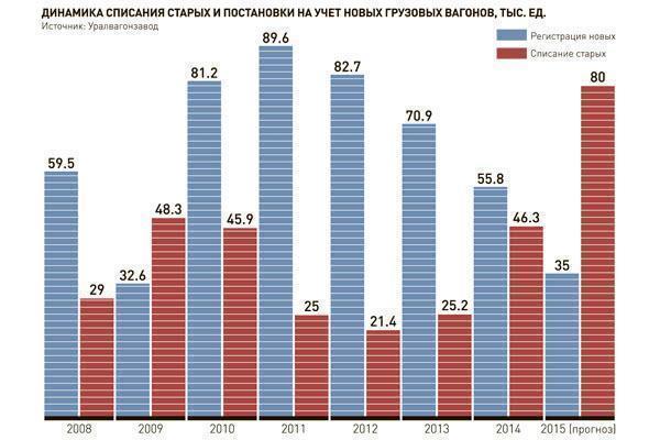 Уменьшение объемов железнодорожных перевозок приводит к проблемам у вагоностроителей. По словам Михаила Бойко, начальника управления продвижения продукции «Уралвагонзавод», спрос на грузовые вагоны начал падать с 2012 года. В первом полугодии вагоностроители выпустили чуть больше 12 тысяч грузовых вагонов, что на 60% меньше прошлого года. Но тут помимо снижения перевозок есть и другая причина - несвоевременное списание вагонов с истекшим сроком службы, которым тоже прямая дорога в лом. С 2008 по 2014 год в эксплуатацию было введено 472 тысячи новых вагонов, что на 230 тысяч больше, чем списано старых. Парк вырос с 1 миллиона грузовых вагонов до 1230 тысяч. При этом роста спроса на новые вагоны в ближайшее время не ожидается, если только волевым решением в лом не отправить старые.