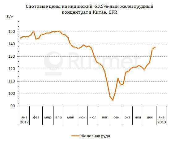 /Rusmet.ru, Виктор Тарнавский/ С конца ноября цены на руду на спотовом рынке идут вверх, поднявшись на месяц почти на 20%. Перед тем, как обороты торговли резко упали в связи с Рождеством, котировки на индийский 63,5%-ный концентрат при поставках в Китай достигли $137-138 за т CFR – самого высокого уровня с начала июля. Некоторые трейдеры в начале третьей декады декабря предлагали высококачественный австралийский материал даже дороже $140 за т CFR.