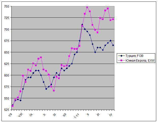 Многие турецкие производители ориентируются на внутренний рынок, но и его емкость не беспредельна. К началу апреля склады и металлобазы оказались заполненными, и металлургам пришлось сбавлять котировки до $655-675 за т EXW (без НДС). По тем же ценам (на условиях FOB) предлагается продукция и на экспорт. Украинские компании предлагают арматуру по $650-670 за т FOB. Им в последнее время также пришлось ограничить поставки на заполненный внутренний рынок и по той же причине сократить экспорт в Россию.