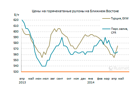 /Rusmet.ru, Виктор Тарнавский/ Заключение контрактов на текущий месяц на поставки плоского проката в страны Ближнего Востока затянулась у российских и украинских металлургов почти до начала апреля. Из-за низкого спроса и спада на европейском рынке производителям в итоге пришлось пойти на довольно существенные уступки. В частности, украинские горячекатаные рулоны продавались в Турцию по $500-520 за т FOB, а цены на аналогичную российскую продукцию опустились до не более $520-530 за т FOB для турецких потребителей и, максимум, до $540 за т FOB на других направлениях. Сейчас металлурги из СНГ готовы открыть продажи майского проката. На что они могут рассчитывать?