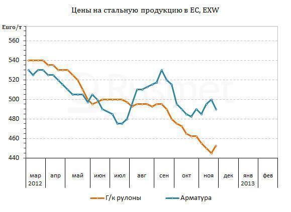 Вследствие этого европейские экспортеры арматуры были вынуждены сбавить котировки до 475-485 евро за т EXW, а на внутреннем рынке верхний предел цен понижается до около 510 евро за т EXW. В той же Германии, а также в странах Восточной Европы по-прежнему наблюдается очень высокая конкуренция между местными производителями, поставщиками из соседних стран, Италии, Украины и даже Турции. Котировки на арматуру после некоторого повышения в середине ноября возвращаются в интервал 485-520 евро за т CPT.