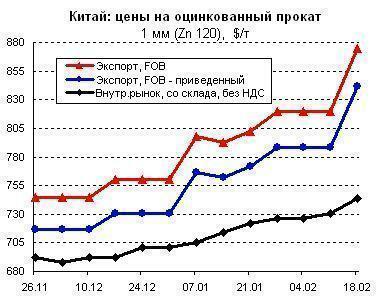 Участники рынка сходятся во мнении, что до конца первой декады марта не стоит ожидать резкого взлета цен на китайскую оцинковку. Однако, учитывая высокий спрос на внешних направлениях и прогнозируемое повышение стоимости подката, вероятно плавное повышение в пределах 20-25 $/т.