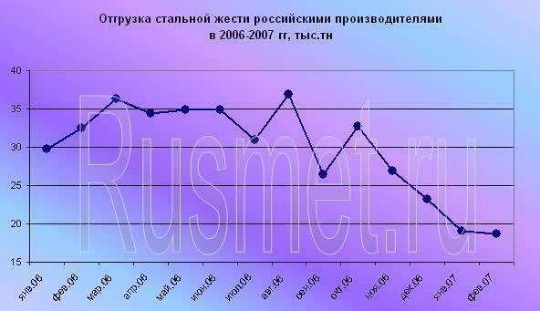 Сокращение поставок жести от российских производителей по итогам двух месяцев 2007 года уже составило порядка 40% по сравнению с периодом январь-февраль прошлого года. В то же время никакой ответной реакции от других участников рынка не наблюдалось. Оборот трейдеров остался невысоким (хотя и вырос по сравнению с январем практически в 1,5 раза). Импорт, достигавший в январе значительных величин, в последний месяц зимы, напротив, сократился на 40%, в результате чего суммарный ввоз жести в страну по итогам двух месяцев оказался на уровне прошлого года.