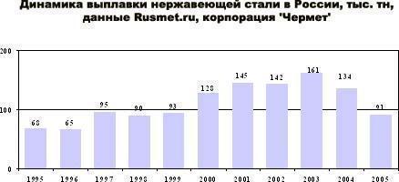 Несмотря на благоприятную мировую конъюнктуру и растущий спрос со стороны конечных потребителей, развитие производства в России испытывает тяжелое положение. Объемы выплавки нержавеющей стали снижаются. По итогам 2005 года объем выплавки сократился до 91,3 тыс.т. Поэтому, можно однозначно утверждать, что без вмешательства государства здесь не обойтись, если мы хотим сохранить Россию, как ведущего поставщика нержавеющей стали. Точнее, даже не сохранить, а возродить, создать, практически с нуля, потому что сегодня доля России в общем производстве нержавеющей стали составляет всего 0,37%!