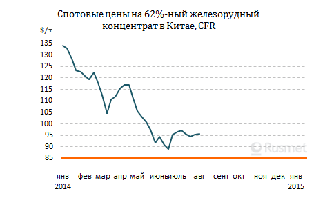 /Rusmet.ru, Виктор Тарнавский/ После того как спотовые цены на железную руду в конце июня несколько восстановились после резкого спада, котировки на этом рынке пришли в равновесие. На протяжении последних двух с половиной месяцев стоимость 62%-ного австралийского сырья в Китае практически не выходила за пределы интервала $94-97 за т. И хотя в конце июля – начале августа здесь наметилось некоторое повышение, большинство аналитиков считают маловероятным возвращение железорудного сырья на уровень более $100 за т CFR Китай.