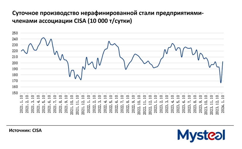 Согласно новым данным, в начале января среднесуточный объем производства заводов-участников достиг 2,02 млн. тонн в день. Этот результат также на 4,9% выше, чем в прошлом году, отмечает CISA.
