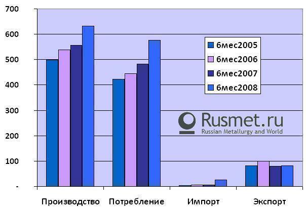 По сравнению с этими показателями в 2008 году произошел настоящий рывок объемов производства. По итогам первого полугодия выпуск стальных рельсов составил свыше 0,63 млн.тонн и увеличился по сравнению с показателями аналогичного периода прошлого года на 13%. Необходимо отметить, что по сравнению с периодом январь-апрель показатели роста объемов производства немного сгладились – тогда они составляли почти 18%.