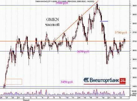 Коррекционное движение акций Норильского никеля (GMKN) вверх достаточно быстро достигло уровня в 3700 рублей, но также быстро вернулось к уровню в 3650 рублей. Необычайно высокие цены на никель способствовали новому подъему цены к уровню в 3700 рублей, но закрепиться выше этого уровня не удалось. В ближайшее время можно ожидать движение в коридоре 3700 -3650 рублей, где важным является уровень в 3650 рублей, снижение ниже которого может дать старт дальнейшему снижению в район незакрытого "гэпа" на 3450 рублях.