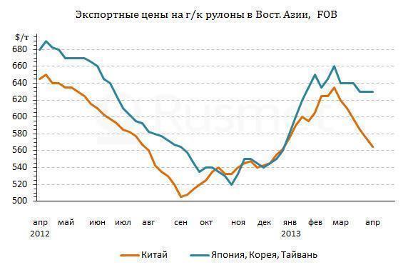 В течение марта стоимость китайских горячекатаных рулонов упала более чем на $40 за т. В первых числах апреля продажи осуществлялись на уровне $560-570 за т FOB. Толстолистовая сталь подешевела до $550-560 за т FOB. При этом, по мнению аналитиков, крайняя точка падения близка, но еще не достигнута. Индийские компании, в частности, сообщают о получении предложений на поставку украинского толстого листа по $560 за т CFR и менее, а вьетнамские покупатели настаивают на удешевлении китайских горячекатаных рулонов до около $550-555 за т FOB.