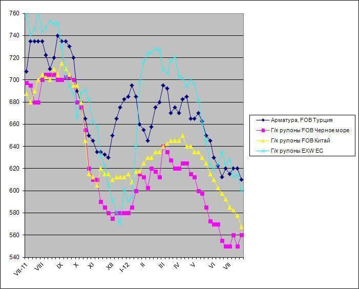 В то же время, европейские, китайские, корейские, турецкие, японские и другие компании, сталкивающиеся с проблемами при сбыте на внутренних рынках, активизируют экспортные операции. В Китае объем экспорта стали во втором квартале 2012 года равнялся, в среднем, 5,04 млн. т в месяц. Это самый высокий показатель с третьего квартала 2008 года. На мировом рынке стали сейчас больше продавцов, чем покупателей. Это, естественно, тянет котировки вниз.