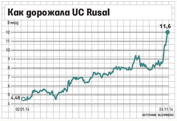 Рост акций UC Rusal может быть обусловлен хорошими результатами III квартала и девяти месяцев 2014 г., поясняет представитель компании. В июле — сентябре UC Rusal впервые с 2012 г. получила позитивный свободный денежный поток ($84 млн) и впервые EBITDA компании ($492 млн) превысила значение III квартала 2011 г. Выручка компании по итогам первых трех кварталов 2014 г. увеличилась на 10,7% до $6,8 млрд.