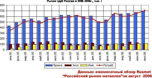 В июле 2006г. российский рынок труб поставил новые рекорды сообщает августовский обзор Rusmet.ru “Российский рынок металлов” (Rusmet-РРМ). Производство, импорт и потребление труб продолжают расти, экспорт – снижаться. По сравнению с июнем 2006г. производство труб в России в июле 2006г. увеличилось на 3,5%, импорт – на 4,9%, потребление – на 6,6%. Экспорт сократился на 11,1%.