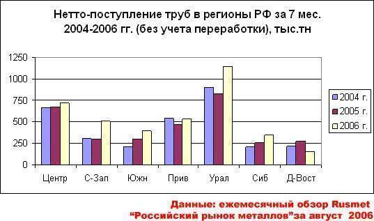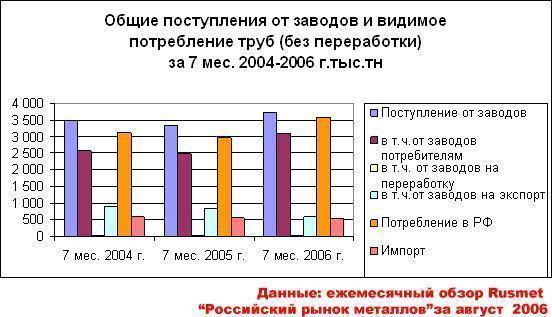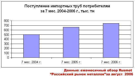 Согласно Rusmet-РРМ, за 7 мес. 2006г. по сравнению с аналогичным периодом 2005г. производство труб в России увеличилось на 17,4%, экспорт снизился на 9,9%, импорт увеличился на 18,6%, потребление труб увеличилось на 24,6%.