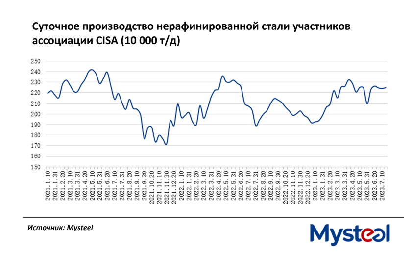 Суточное производство стали на предприятиях-членах Китайской ассоциации черной металлургии (CISA) за десять дней с 11 по 20 июля восстановилось, увеличившись на 0,3% или на 7 400 т/сутки по сравнению с началом июля и составило в среднем 2,25 млн. т/сутки, согласно последним данным ассоциации, опубликованным 24 июля. Небольшой рост свидетельствует о том, что предприятия стремились наращивать производство после того, как их надежды на восстановление спроса умеренно укрепились в течение этого периода, пояснили источники.