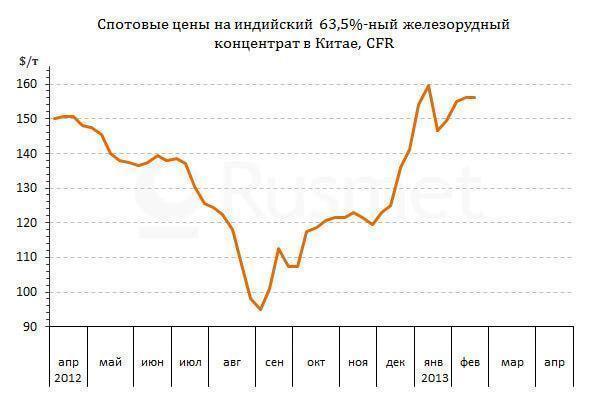 /Rusmet.ru, Виктор Тарнавский/ Коррекция на спотовом рынке железной руды в середине января так и не превратилась в спад. После краткосрочного понижения котировки снова пошли вверх, так что в первой декаде февраля, перед началом новогодних праздников по китайскому календарю, уровень цен на 63,5%-ный индийский концентрат достиг $155-157 за т CFR Китай, лишь немного не дойдя до наивысшей отметки начала января текущего года.