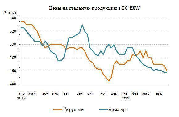 Для европейских металлургов проблема обостряется еще и вследствие превышения предложения над спросом. По итогам первого квартала 2013 года выплавка стали в ЕС сократилась на 5,4% по сравнению с показателями аналогичного периода годичной давности, при этом, в 10 странах спад превысил 10%. Вследствие относительно низкого курса евро по отношению к доллару объемы импорта в последнее время сравнительно невелики. Тем не менее, участники рынка говорят об избыточном объеме предлагаемой к продаже стальной продукции, особенно, длинномерной. Производителям не помогла даже некоторая активизация строительных работ с начала апреля. К концу месяца котировки на арматуру не превышают 435-455 евро за т EXW в Италии и 480-500 евро за т CPT в Германии и Польше, где очень велика конкуренция между поставщиками из разных стран.