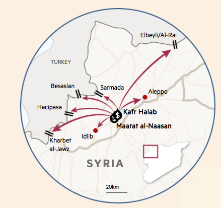 Топливные рынки есть всюду на контролируемых ИГИЛ и удерживаемых «сирийскими повстанцами» территориях Сирии, они часто расположены рядом с НПЗ. В большинстве городов есть небольшой топливный рынок, где местные жители покупают и продают нефть. Но торговцы, поставляющие нефть на эти меньшие рынки, часто покупают ее оптом в крупных центрах.