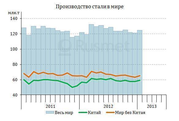 Однако, прежде всего эта информация показывает, что отрасль по-прежнему находится в глубоком кризисе. Средний уровень загрузки мощностей в глобальной металлургии, по данным WSA, в январе 2013 года сократился до 71,2%. Это самый низкий показатель с мая 2009 года. И вообще, уменьшение загрузки в январе по сравнению с декабрем представляет собой уникальный случай за последние годы.