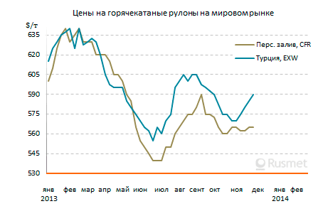 Несмотря на то, что турецкая экономика несет немалый урон от продолжающегося экономического спада в странах Европейского Союза, конъюнктура местного рынка стали остается достаточно благоприятной. Турецкие потребители охотно заключают контракты с поставкой в январе и первой половине февраля. Стоимость горячекатаных рулонов национального производства достигла, при этом, $585-595 за т EXW, что примерно на $15 за т превышает уровень месячной давности.