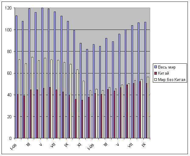 Тем не менее, между двумя составными частями мирового металлургического сектора больше общего, чем различного. И, прежде всего, – это избыточный объем производства. Стали выплавляется слишком много, причем, везде. Интересно, если сравнить сентябрьские показатели с январскими, мы получим практически одну и ту же картину. Мировое производство стали в сентябре было на 23,8% больше, чем в январе. Китайские показатели за этот же период возросли на 23,1%, остальной мир дал прибавку на 24,5%. При этом, в тех регионах, которые, как утверждают экономисты, больше всего пострадали от кризиса, мы увидим весьма впечатляющий прогресс: страны ЕС-27 дали 34,1% роста в сентябре по сравнению с январем, в США – 31,8%. Судя по тому, как складывается сейчас ситуация на рынке, металлурги перестарались, возвращая в строй мощности.